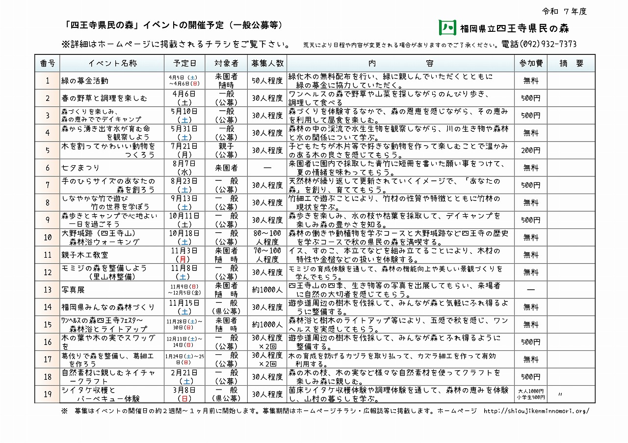 四王寺県民の森のイベントのご紹介。県民の森では一年を通して各種イベントを開催しています。