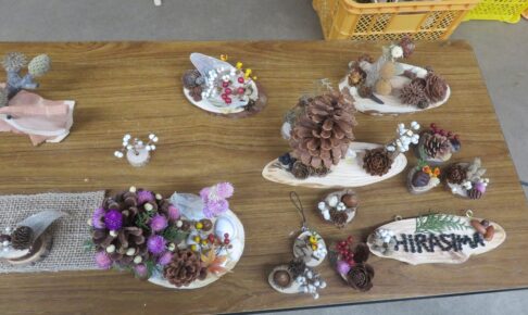 雨水の候、研修室でイベントを行いました。講師より、注意事項など説明の後、小枝・木の実・ドライフラワー・カズラ・竹材等を、グルーガン・木工ボンド・竹ひご・麻紐・ウッドバーニングペンなどを使…