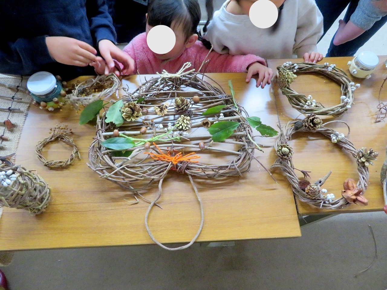 大寒の候、イベントを行いました。まず、カズラの種類や性質などを学習の後、林道に出てカズラを皆で引っ張り採集しました。適当な長さに切り、研修室に戻りカズラを丸めたり編んだりしました。木の実や麻紐、麻布などを飾りました。出来上がった作品を皆で総評して終了しました。雪の翌日でしたが皆さんとても楽しんで帰られました。
