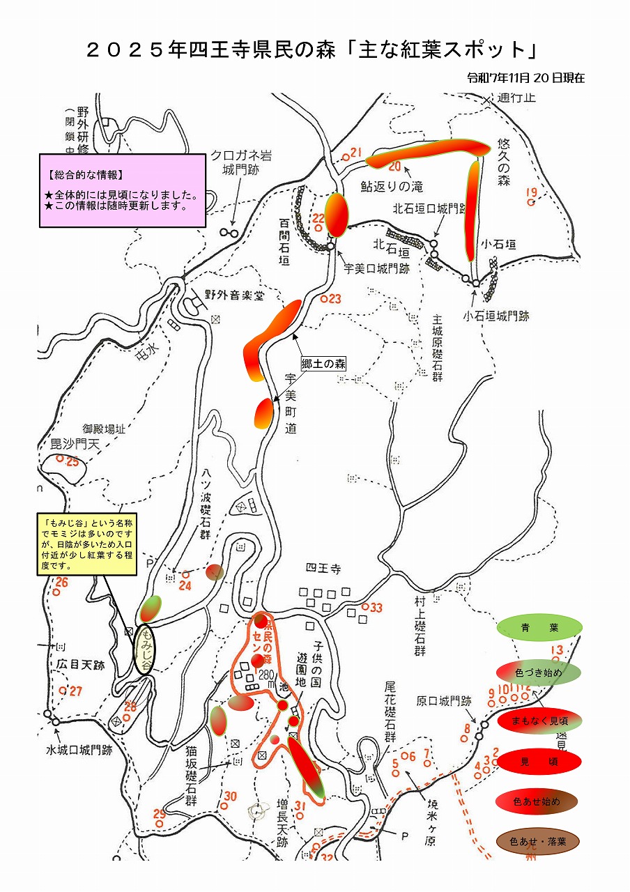11/20(木)現在、すべての地点でもみじの色づきは見頃になりました。詳しくは地図をご覧ください。