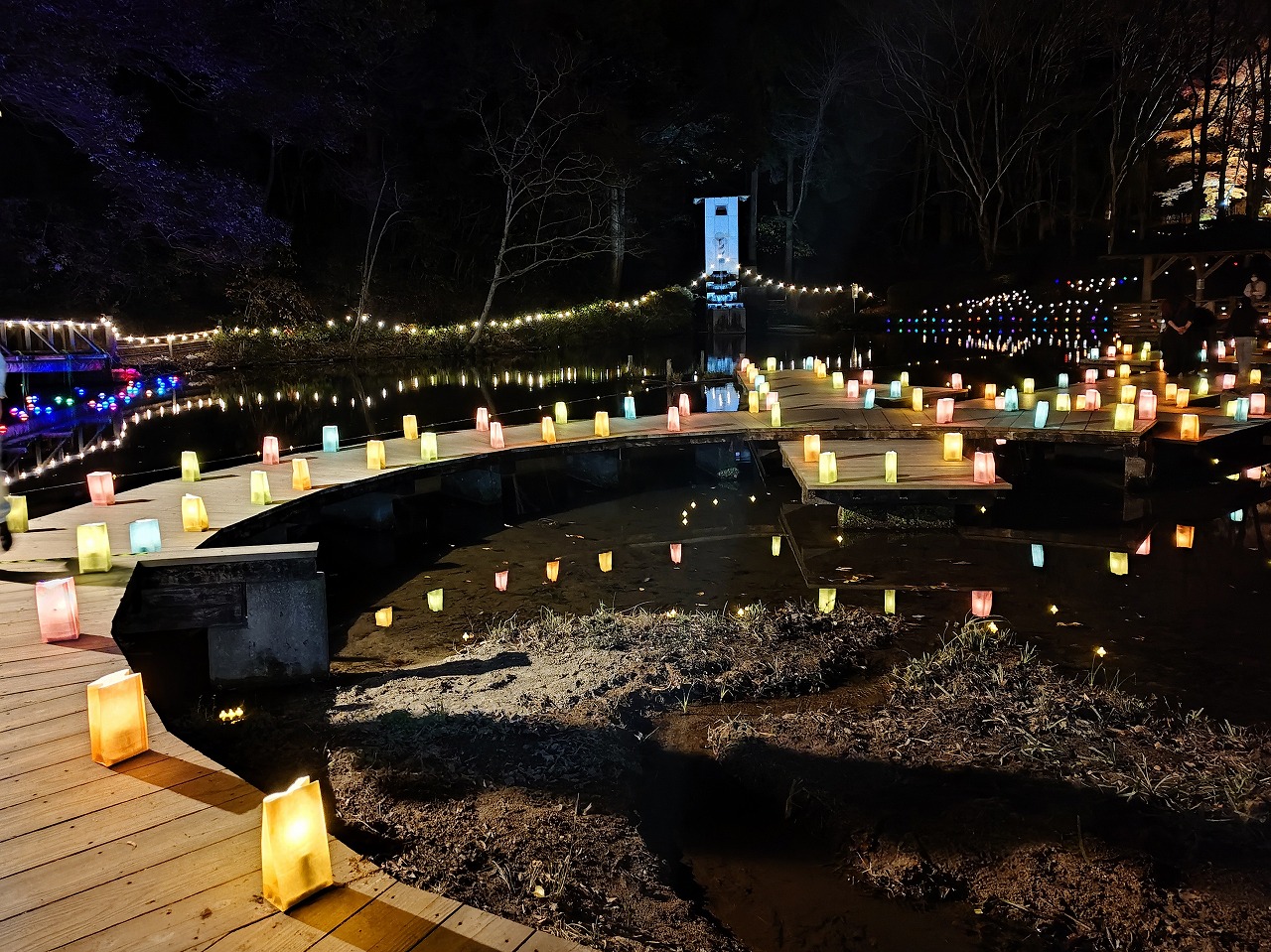 初冬の候、漏刻の池周辺で3日間イベントを行いました。28日(金)~30日(日))は17:30~19:00ライトアップを行いました。29日(土)~30日(日)は10:00~11:30バードウォッチング、13:00~14:00,14:30~15:30,16:00~17:00はワンヘルスガイドにより森林浴体験ツアーを行いました。30日(日)は、文化財の専門家による「特別史跡大野城跡を学ぼう‼️」の解説を11:00~11:30,13:00~13:30,14:30~15:00にピロティや礎石の前で行いました。センター入口で「虫媒介感染症対策を学ぼう!」を行いました。紅葉は終わりかけでしたが、お天気に恵まれ大変喜ばれました。ライトアップも、去年より少しバージョンアップして綺麗でした。