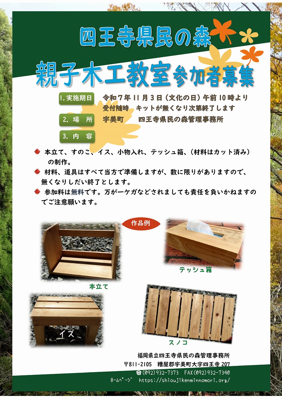 文化の日、イベントを行います。日時:11月3日(月・祝日)10:00より随時受付 場所:県民の森管理事務所(宇美町大字四王寺207)内容:本立て・スノコ・椅子・小物入れ・ティッシュケース(材料はカット済み)の制作(材料がなくなり次第終了) 参加費:無料 詳しくはチラシをご覧ください。